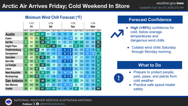 The National Weather Service says confidence is high for well-below-average temperatures and dangerous wind chills as the Arctic airmass settles over South-Central Texas this weekend. Forecasters place a 40 to 60 percent chance of at least minor winter weather impacts over the Hill Country, primarily from icy road conditions.