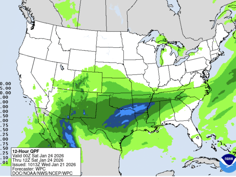 The weather service warns an “abnormally large supply of moisture” could intersect with the freezing temperatures, creating conditions for freezing rain and sleet. Rain is expected to begin Friday before temperatures are below freezing, then transition to a wintry mix from north to south Saturday into Sunday as subfreezing air undercuts the precipitation.