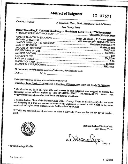- Oct. 12, 2012 — 216th District Court issues a $280,858 judgment against Bates on behalf of Kerrville couple Dorsey and Charlene Spaulding.