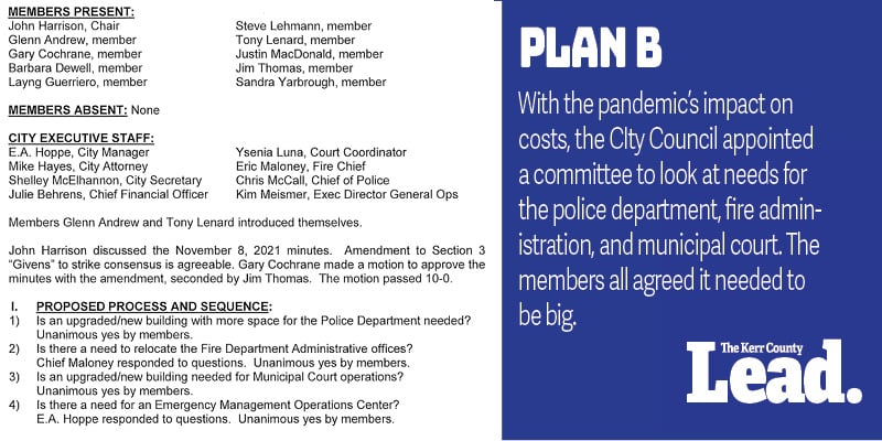 The City Council voted to appoint a 10-member citizen panel to recommend the new public safety building. The city’s one problem was a 2019 plan that had remained confidential about the public safety building. That plan recommended building on existing city-owned property, including a plan to build around the current police station. In the chaos of Let Us Vote’s efforts, Kerr County Judge Rob Kelly bought up the land around the station to potentially expand Kerr County services.