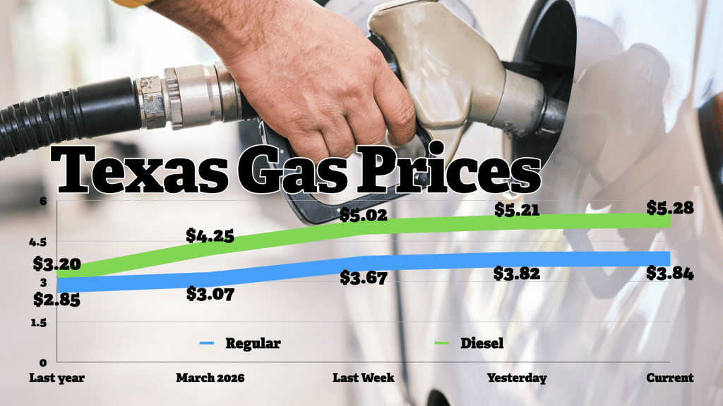 The more striking number is the statewide diesel figure. The Texas average hit $5.286 per gallon Tuesday, up 7.4 cents from Monday and 25.7 cents from last week. The all-time Texas diesel record stands at $5.326, set June 19, 2022. At the current pace of increases, that record could fall within days.
