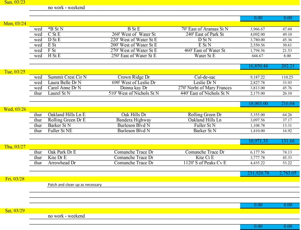 In a separate effort to maintain city streets, Kerrville will begin its annual slurry seal project on Tuesday, March 18. The process, which involves applying a protective mixture to extend the life of roadways, will require temporary lane closures and parking restrictions on affected streets. Residents are advised to observe posted signs and barricades for their safety.